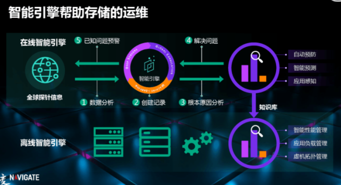当前,新华三智能数据引擎分为在线智能引擎和离线智能引擎两种。在线智能引擎具有自动预防、智能预测以及应用感知等共同,通过全球联网可以最快获取相应的服务,比如某个存储问题只要范围内发生了一次,就可以为全球用户类似问题进行免疫,推送相应的解决方案。