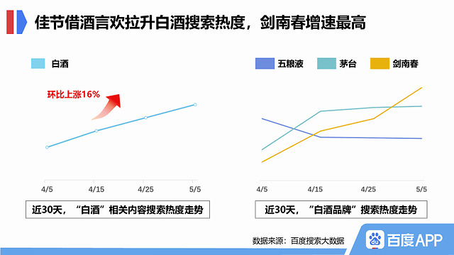 消费者酒水消费需求的提升也集中反映在搜索行为上。百度的全平台监测数据显示,“白酒”相关内容的搜索热度在过去一个月已经出现环比16%的增幅。值得注意的是,以剑南春为代表的白酒品牌在这一阶段的搜索热度出现了陡峭上升的状况。