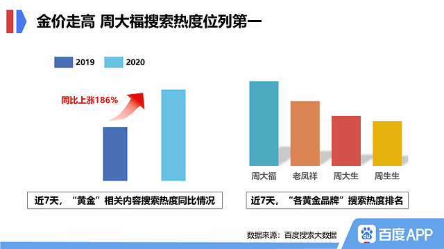 从搜索数据来看,金价的不断攀升明显刺激了人们的购买热情——近一周时间以来,“黄金”等相关内容在百度上的搜索热度已经同比上涨了186%。这一趋势也为主要银楼品牌带去了大量增量用户,包括周大福、老凤祥、周大生、周生生等品牌都从搜索渠道获得了不少目标消费者的高度关注。