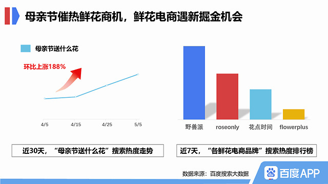 例如疫后迎来第一个母亲节的时点,就成为鲜花品牌竞逐消费者的激烈关口。从百度搜索大数据中可以看到,针对鲜花的需求在母亲节期间迎来了“大爆发”。发出“母亲节送什么花”这一问题的搜索用户,环比增加了188%之多,这对于整个鲜花行业而言意味着不容小觑的增量用户池。