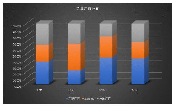 这组数据展示出各类厂商的部署具有一定的地缘性(全球最大独立开源公司SUSE起源于欧洲,绝大多数start-up厂商和传统厂商总部在北美),深耕本地市场是理所当然。
