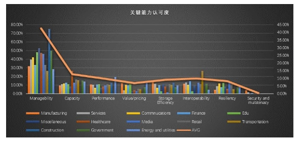 * 可管理性在各行业的平均认可度是42.64%,远超其他关键能力。这反映出分布式文件系统与对象存储产品给用户最直观和深刻的感受便是安装、部署、运维等操作的简单性和易用性;