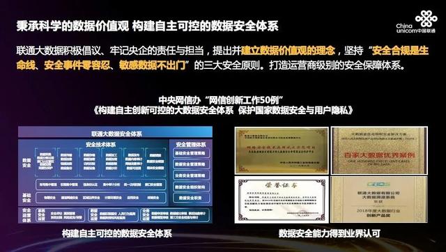 为加强关键信息基础设施安全保护,强化国家关键数据资源保护能力,增强数据安全预警和溯源能力,联通大数据基于“安全合规是生命线、安全事件零容忍、敏感数据不出门”的数据价值观,构建了涵盖安全组织、安全策略,安全技术及安全运营四个方面的自主可控的大数据安全体系,保障数据业务及应用的安全。