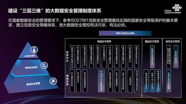安全策略层面,根据国家法律法规标准的最新要求,联通大数据建立“三层三维”的数据安全策略体系,体系明确了数据安全管理的范围,为数据安全管理工作提供了标准和规范。