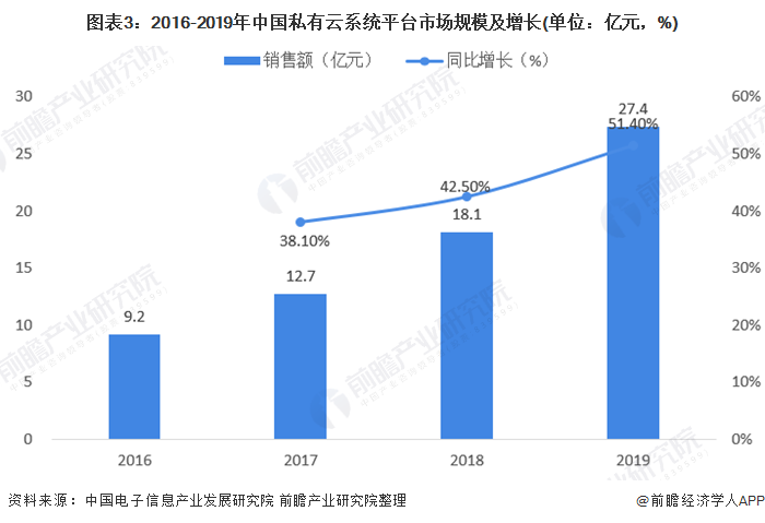 2016-2019年,中国私有云系统平台市场规模逐年上升。2019年中国私有云系统平台市场规模达到27.4亿元,同比增长51.4%。