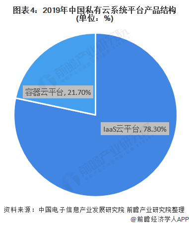 从产品结构来看,2019年中国IaaS市场规模为21.5亿元,占私有云系统平台市场规模的78.3%;容器云平台为应用提供标准化的运行环境,2019年中国市场规模为5.9亿元,占私有云系统平台市场规模的21.7%。