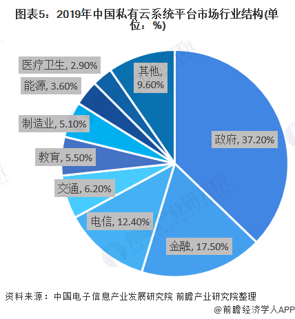随着“新基建”进程的加快,作为算力中枢和数字底座的云计算将迎来新的增长空间。政府、金融、电信等行业由于数据的高度敏感性,要求部署私有云;交通、制造、能源等领域中的众多大型企业资金实力雄厚,为了保障自身数据和业务的安全性和灵活性,也倾向于搭建私有云。2019年中国私有云市场规模达到817.4亿元,其中硬件、软件和服务市场分别占69.5%、15.9%和14.6%。2019年中国私有云系统平台相关市场的占比达到30.2%,市场规模达到27.4亿元。从产品结构来看,IaaS云平台占私有云系统平台市场规模的78.3%;容器云平台占私有云系统平台市场规模的21.7%。从行业应用结构来看,政府、金融和电信为前三应用行业,2019年市场规模合计占比达67.1%。