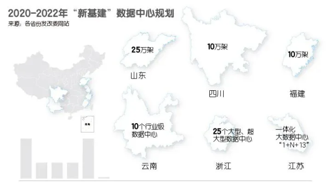 不少省份和城市认识到算力的重要性,纷纷开始加速城市算力的培育和提升,明确提出建设数据中心的目标计划。在各省新出台的新基建专项政策中,山东表示2022年前在用数据中心机柜数达到25万架,四川和福建各自提出达到10万架,云南也提出到2022年建成10个行业级数据中心,浙江表示要建成25个大型、超大型数据中心。