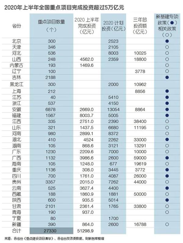 根据年初各省公布的《重点项目清单》统计,全国共有约2.7万个投资项目,规划投资总规模达到近50万亿元,其中2020年年内投资总规模达到8.4万亿元。多个省份在疫情之后又相继公布增补清单及调整清单。最终2020年年投资额超过10万亿元。根据不完全统计,已有21个省份公布上半年重点项目进展情况,共计完成投资5.1万亿元。据不完全统计,其中“新基建”相关项目占项目总数的14%左右。