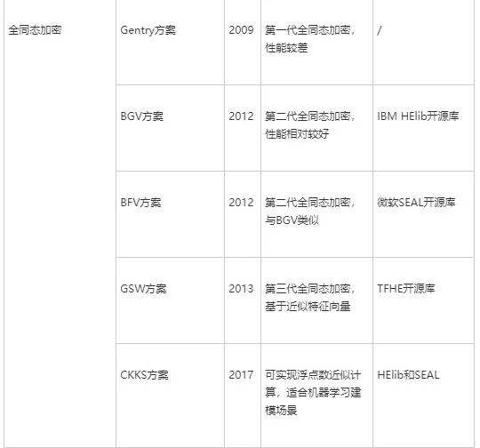 全同态加密算法的发展起源于2009年Gentry提出的方案,后续方案大多基于格代数结构构造。目前已在主流同态加密开源库中得到实现的全同态加密算法包括BGV方案、BFV方案、CKKS方案等。