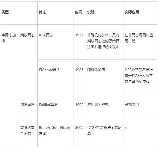 在实际应用中,密文乘法同态性的需求场景不多,因此乘法同态性通常偶然存在于已有的经典加密算法中。满足乘法同态特性的典型加密算法包括1977年提出的RSA公钥加密算法和1985年提出的ElGamal公钥加密算法等。