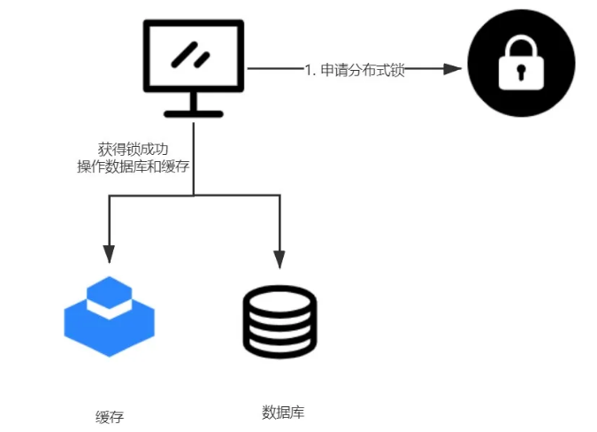 在平时开发中,利用分布式锁可能算是比较常见的解决方案了。利用分布式锁把缓存操作和数据库操作封装为逻辑上的一个操作可以保证数据的一致性,具体流程为: