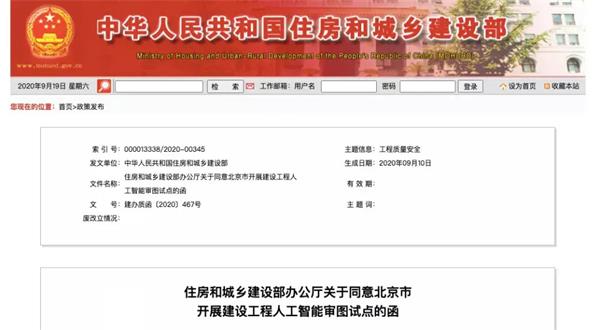 同意你市开展建设工程人工智能审图试点工作。你委要按照《国务院办公厅关于全面开展工程建设项目审批制度改革的实施意见》(国办发﹝2019﹞ 11号)、《国务院办公厅转发住房城乡建设部关于完善质量保障体系提升建筑工程品质指导意见的通知》(国办函﹝2019﹞92号)要求,在现有数字化审图系统基础上,引入人工智能相关技术,研发人工智能审图基础系统,形成可靠的人工智能审图能力,进一步提升审查效率,提高勘察设计质量,推动勘察设计行业的数字化转型和高质量发展。试点工作进展和取得的经验及时报我部工程质量安全监管司。