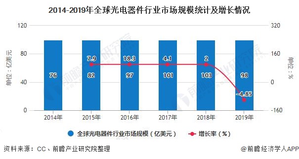 根据C&C数据显示,2014-2018年全球光电器件市场规模持续增长,2019年增长出现回落,市场规模为98亿美元,同比下降4.85%。其中中国光电器件市场规模为36亿美元,同比下滑2.7%,占全球光器件市场规模37.5%的市场份额。