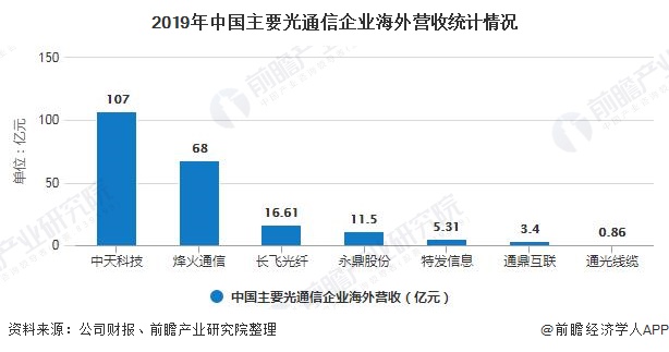 通过分析几大光通信企业的年报不难发现,这些企业的海外营收都占了较大的比重,不仅如此,扩大海外市场版图的动作也越来越多样化。2019年,海外营收总数最多的企业是中天科技,海外应收达107亿元,其次是烽火通信,实现营收68亿元;
