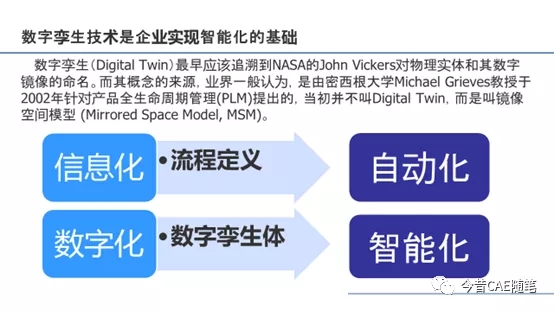 自动化聚焦于生产,着眼于管理,用信息化技术通过流程定义实现自动化,解决的是效率的问题。智能化聚焦于研发,着眼于创新,用数字化技术通过数字孪生体实现智能化,解决的是能力的问题。