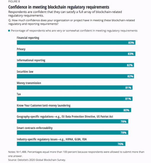 调查数据显示:受访者坚信他们有能力满足监管要求,如税务、财务报告、行业特定规则和证券法等领域的要求,这与上述的数字资产方面的法规场景要求是一致的。