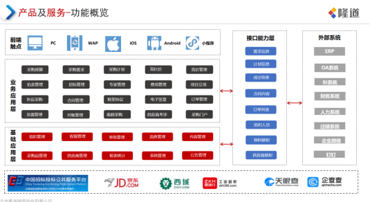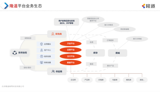 目前,隆道公司已陆续服务采购企业20余万家,覆盖制造、工程、能源、化工、医疗、纺织、食品、电子等27个行业,100多万家供应商资源,年采购项目量超30万个,年交易额超400亿元人民币。