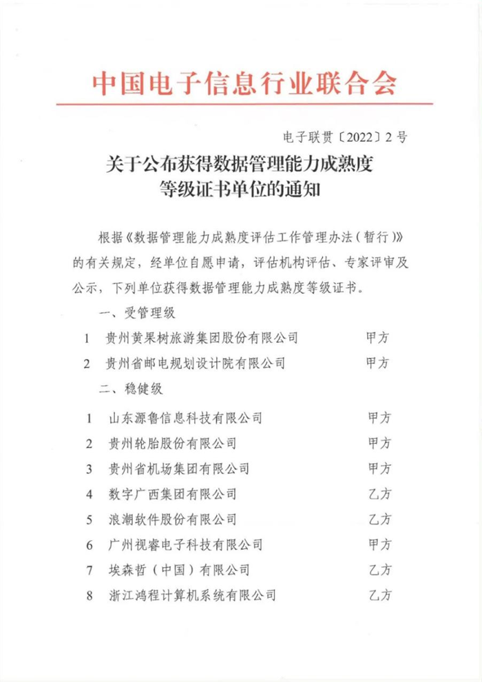 近日,中国电子信息行业联合会公布了最新一批获得数据管理能力成熟度(DCMM)等级证书的企业名单。嘉诚信息正式通过DCMM稳健级(3级)认证,标志着嘉诚信息在为客户提供优质数据产品及实施数据治理服务的能力方面,获得了行业认可。
