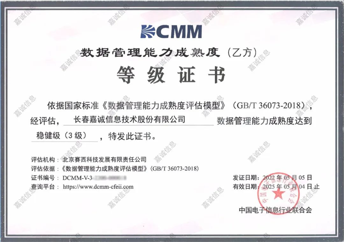 热烈祝贺嘉诚信息获国家数据管理能力成熟度(DCMM)3级认证