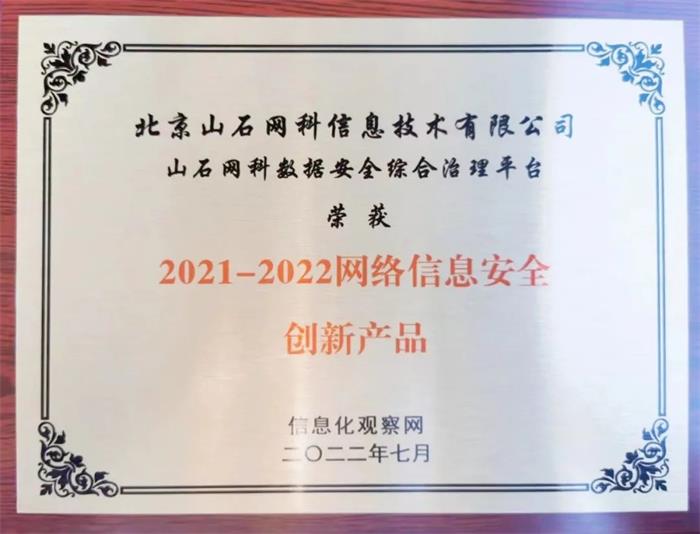 图注:山石网科数据安全综合治理平台荣获“2021-2022网络信息安全创新产品”