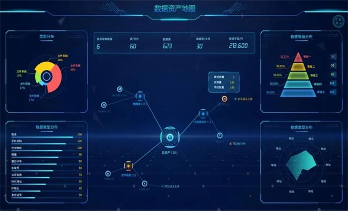 数据资产可视化:对数据进行全盘梳理,全方位、多维度展现数据资产现状,包含数据资产数量、敏感类型分布、访问权限等,形成数据资产台账;可基于业务场景和行业标准制定相应数据分类分级规则,形成数据分类分级清单。