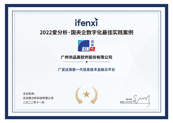 近日,由爱分析主办的“国央企数字化最佳实践案例”评选活动落下帷幕。活动围绕实践领先性、案例创新性、应用成熟度、价值创造四个维度对候选实践案例进行评选,最终评选出25个具有参考价值的创新案例,广州市品高软件股份下有限公司(以简称“品高股份”)凭借为广发证券股份有限公司(以下简称“广发证券”)打造的新一代信息技术金融云平台,成功入选!