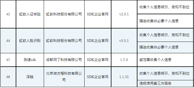 依据《个人信息保护法》《网络安全法》《电信条例》《电信和互联网用户个人信息保护规定》等法律法规,我部组织第三方检测机构对群众关注的生活服务类移动互联网应用程序(APP)及第三方软件开发工具包(SDK)进行检查。发现46款APP(SDK)存在侵害用户权益行为(详见附件),现予以通报。