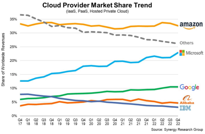 在最大的云供应商中,微软的全球市场份额强劲上升,目前已达到23%,而前4个季度的平均水平为21%。与此同时,市场领导者亚马逊长期保持32-34%的市场份额范围内;谷歌的份额为11%,与上一季度持平,但比一年前高出1个百分点。这三个领导者合计占全球市场的66%,高于一年前的63%。