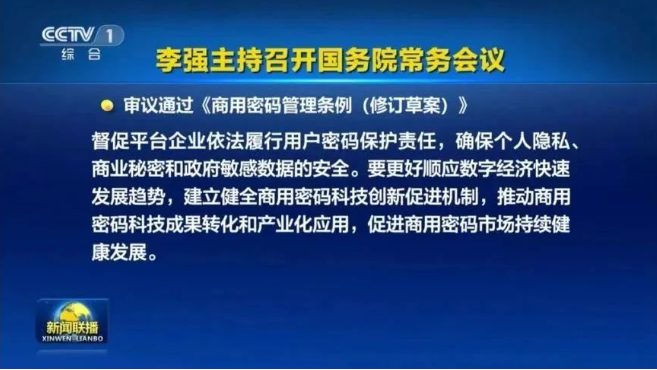 4月14日,国务院总理李强主持召开国务院常务会议,会议审议通过《商用密码管理条例(修订草案)》。
