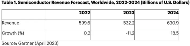 半导体市场的短期前景进一步恶化。预计2023年全球半导体收入总额将达到5320亿美元(见表1)。
