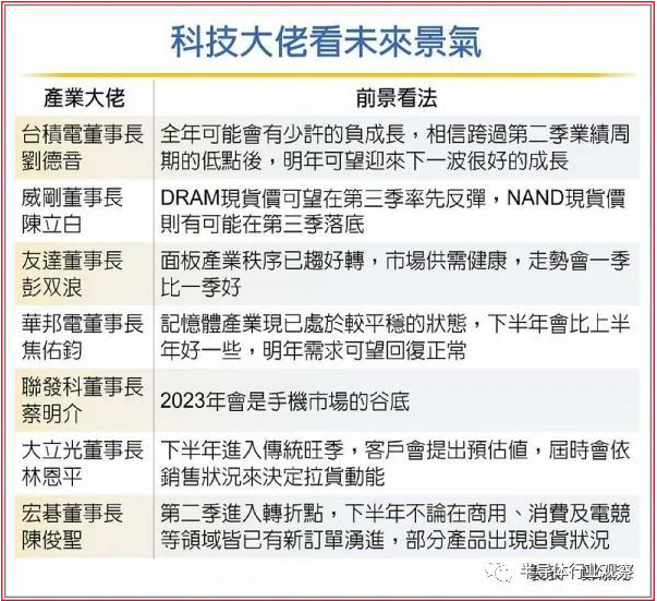 复苏曙光现也照到最疲弱的手机和笔电市场,焦佑钧慨言,内存产业现处于较平稳的状态,预期产业会在第二季触底,手机市场将较其他消费性电子产品率先回温,内存产业下半年会比上半年好一些,明年需求则会回复正常,并强调「现在我对下半年没有特别担心的地方」。蔡明介预期,2023将是手机市场谷底,因为AI导入之后,手机将迎来技术革新,准备进入下一个周期,预估两年就会恢复成长。