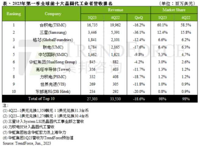 今年第一季度晶圆代工厂的营收表现都不好,这是由2022下半年的芯片消费市场行情决定的,那么,在即将结束的2023年第二季度,晶圆代工厂会有怎样的营收表现呢?这就要看今年第一季度全球芯片市场的供需状况了。