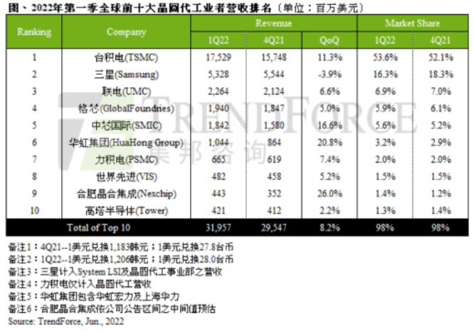 作为对比,我们看一下2022年第一季度全球十大晶圆代工厂营收榜单,如下图所示。
