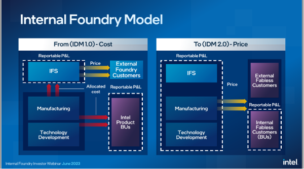 John Pitzer在投资者会议上表示:“我们的制造部门,包括内部制造、技术开发和英特尔代工服务,将合并成为一个单独核算的部门。如同CCG、DCAI、NEX和Mobileye等部门将损益单独核算一样。制造部门单独核算将在2024年Q1的财报中体现。”此外,John Pitzer还表示,该模式已经内部开始运转,下半年还将举办一个关于英特尔代工服务的更详细、更详尽的网络研讨会。