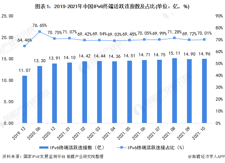 中国IPv6终端活跃连接占比约70%:IPv6终端活跃连接数指基础电信运营商统计得出的,已经获得IPv6地址,且在30天内具备有效IPv6流量记录(不包含Ping和域名解析流量)的固定和移动终端数量。IPv6终端活跃连接占比反映我国IPv6终端活跃连接占全部终端数量的比例。