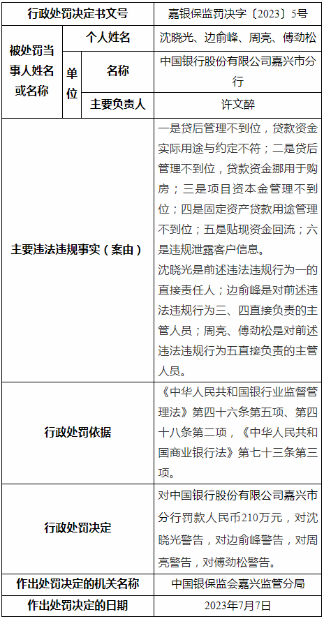 2023年7月18日,国家金融监督管理总局发布的行政处罚信息显示,中行嘉兴分行存在6项主要违法违规行为,其中包括“违规泄露客户信息”等,依据《中华人民共和国银行业监督管理法》第四十六条第五项、第四十八条第二项,《中华人民共和国商业银行法》第七十三条第三项,被原银保监会嘉兴监管分局处以罚款210万元。