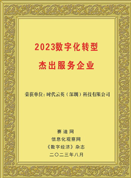 极其荣幸的是,时代云英凭借自身在数字化转型方面的辛勤耕耘,从众多优秀企业中脱颖而出,斩获了“数字化转型杰出服务企业”这一奖项。这是一项极具声望的奖项,旨在表彰那些在数字化转型方面做出卓越贡献的企业。我们感到无比自豪能够成为其中的一员,并将继续为数字化转型的推广和实践而努力。