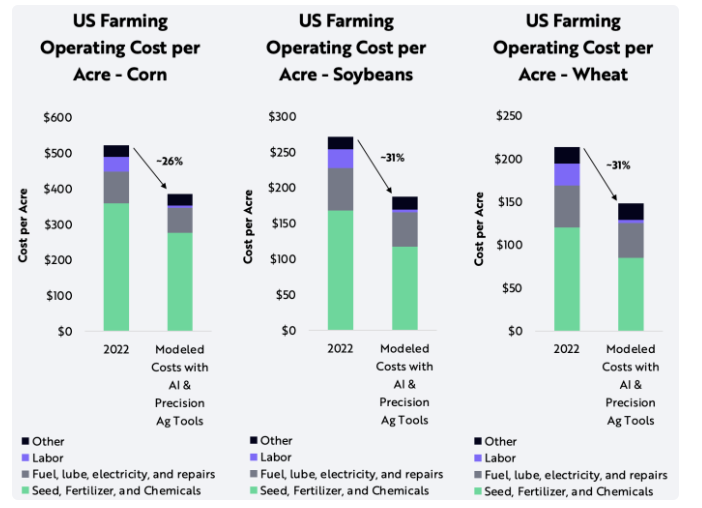 当前AGCO、CNH Industrial、Deere&Company,和Komatsu等公司正在创造创新解决方案以提高农场生产力,他们推出了一系列的精准农业工具。ARK Invest的研究显示,See and Spray Ultimate喷雾器、ExactShot播种机和自动驾驶技术的结合将降低几项农业成本,人工智能和精准农业的结合可以将美国玉米、大豆和小麦种植的每英亩运营成本降低26%、31%和31%: