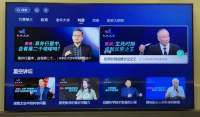 据悉,原来是此前7月份中国广电集团方面与中国科协科普部、中国科学技术出版社达成了深度合作,共同在全国有线电视网络内容集成播控平台开设“科普中国”视听内容点播专区,分为星空讲坛、改变世界的30分钟、航天科技解读、食品安全、智惠农民、医疗健康、军事科技、科学辟谣等栏目。