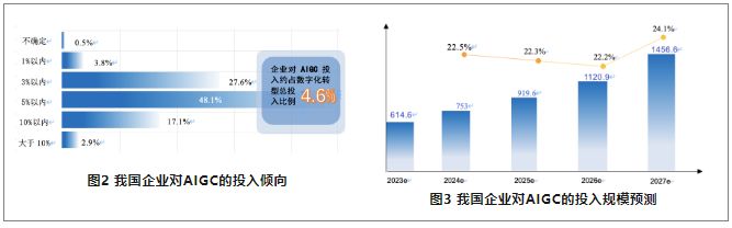 虽然相比于国际先进科技公司,我国AIGC产业尚处于起步阶段,底层技术和商业化落地与国外相比有一定差距。当前国内AIGC产业可大致分为基础设施层、模型层及应用层,整体层级尚不够完整,模型层成为当前关键卡口,在一定程度上限制了上下层级的发展。但国内企业对于AIGC的投入热情较高,占企业数字化转型总投入的4.6%,并有预测显示2027年投入将会达到1456.6亿元。