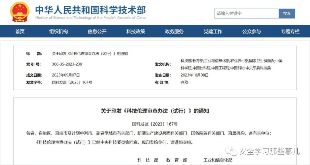 2023年10月8日,科技部会同教育部、工业和信息化部等10部门印发了《科技伦理审查办法(试行)》(下称《办法》)。《办法》要求,科技伦理审查应坚持科学、独立、公正、透明原则,公开审查制度和审查程序,客观审慎评估科技活动伦理风险,依规开展审查,并自觉接受有关方面的监督。涉及国家安全、国家秘密、商业秘密和敏感事项的,依法依规做好相关工作。