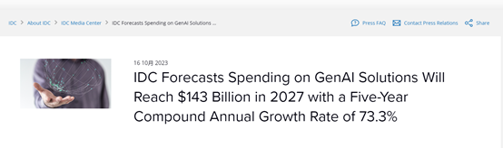 IDC表示,2023-2027年的复合年增长率(CAGR)为73.3%。这是整体人工智能支出增长率的2倍多,几乎是同期全球IT支出复合年增长率的13倍。