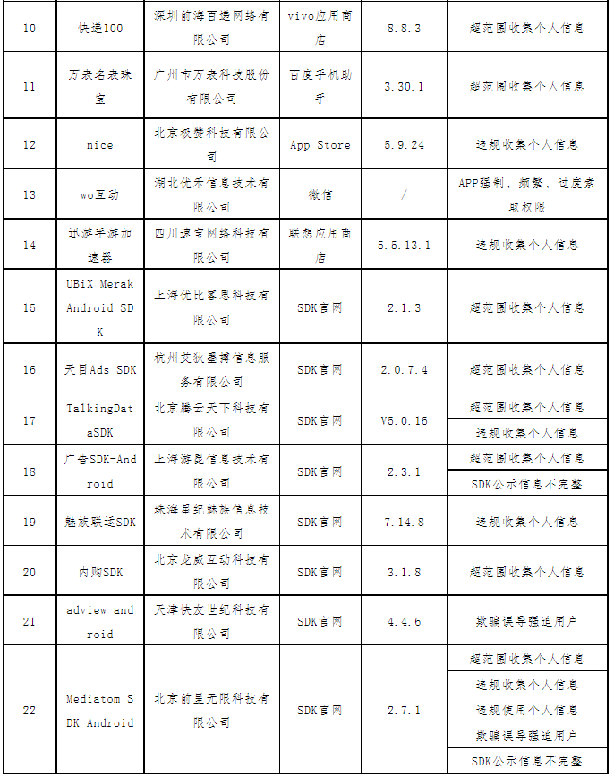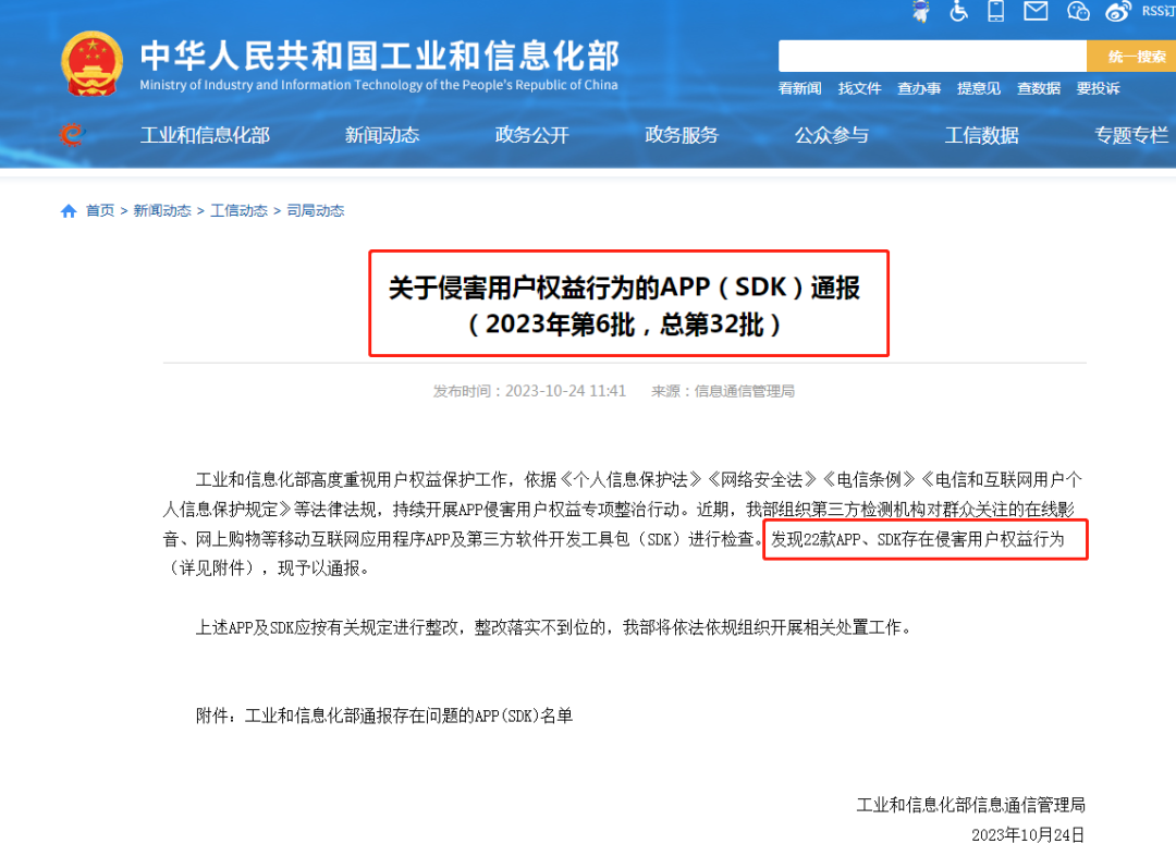10月24日,工信部通报22款APP(SDK)存在侵害用户权益的行为。
