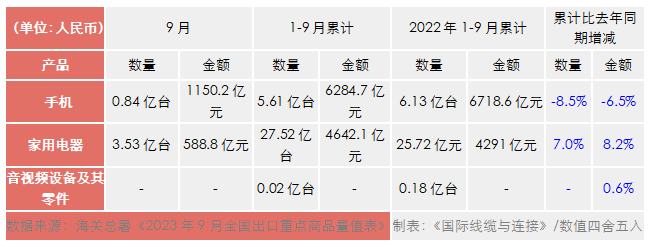 《国际线缆与连接》记者查阅海关总署公布数据了解到,我国9月份手机、电脑出口环比分别增长124.9%和8.3%,较8月份同比降幅分别收窄14.3%、13.4%;同时,我国集成电路的进出口在8月与9月连续环比回升,据悉,集成电路在消费电子领域应用广泛,如笔记本电脑、平板电脑、智能手机、游戏机等。