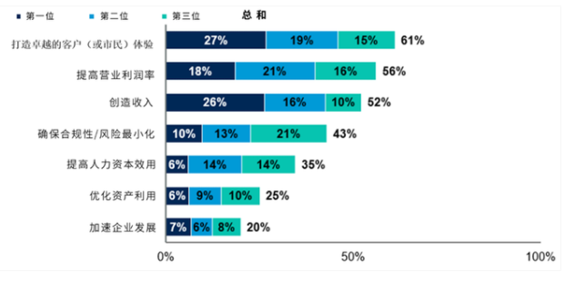 调研显示,CIO和IT领导人认为创造卓越的客户或市民体验、提高营业利润率和创造收入是数字技术投资的最重要成果(见图二)。