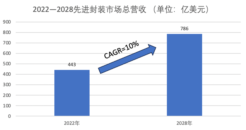 首先,随着传统芯片制造愈发趋近于物理极限,先进封装市场增量越来越大。市场调研机构Yole数据显示,2022年先进封装的市场总营收预计为443亿美元,预计到2028年将达786亿美元,复合年均增长率将达到10%。此外,先进封装的市场比重将逐渐超越传统封装,成为封测市场贡献主要增量。