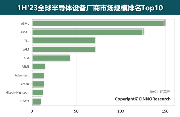 2023年上半年,全球半导体设备厂商市场规模排名出现调整。ASML以超148亿美元的营收跃至榜首,应用材料凭借124亿美元的营收紧跟其后,东京电子也反超泛林夺得第三名,科磊则依旧名列第五。
