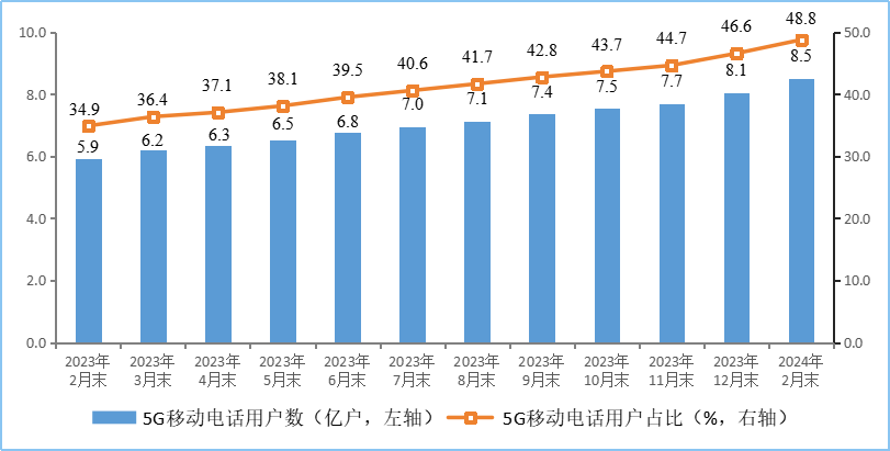 用户方面,截至2月末,三家基础电信企业及中国广电的移动电话用户总数达17.46亿户,比上年末净增240.9万户。其中,5G移动电话用户达8.51亿户,比上年末净增2922万户;占移动电话用户的48.8%,占比较上年末提高2.2个百分点。