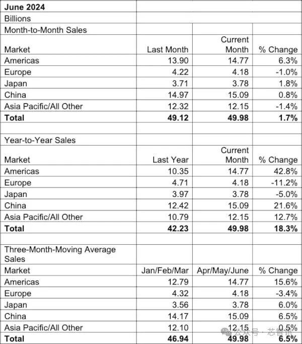 从区域表现来看,今年二季度美洲地区的半导体销售额的月平均值为147.7亿美元,同比大涨了42.8%。相比之下,中国大陆同比增长了21.6%,亚太地区(不包括中国大陆和日本)的同比增长了12.7%,欧洲地区则同比下滑了11.2%,日本同比下滑了5%。